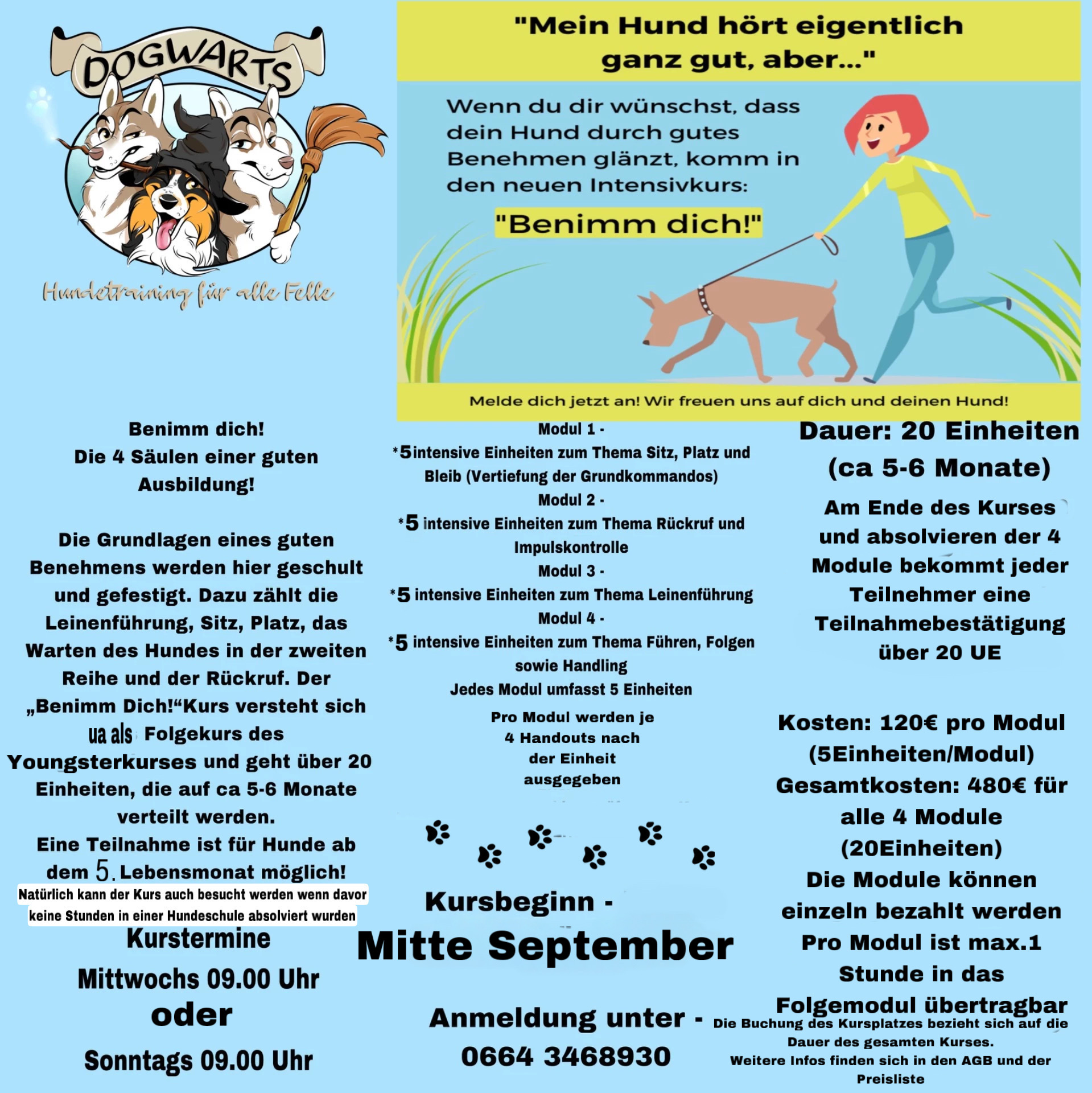 Der Kurs findet zweimal wöchentlich statt - jedes Mensch/Hund Team kann sich, nach verbindlicher Anmeldung zum Kurs,